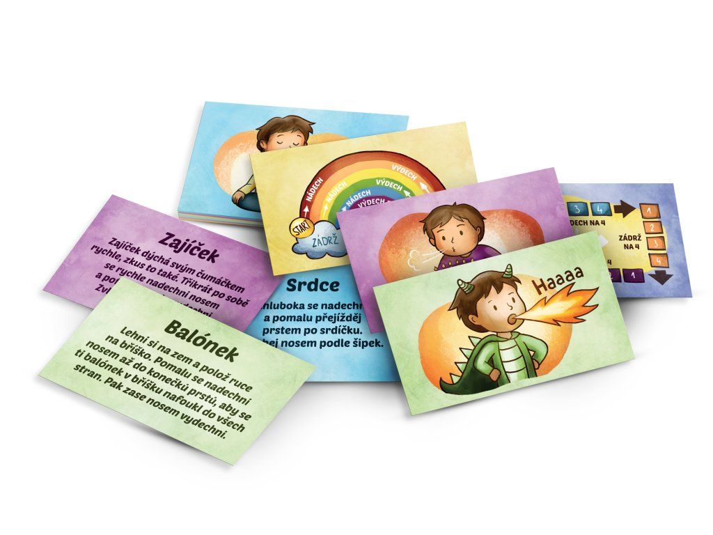 Karty pomáhají dětem naučit se správně dýchat, vnímat své tělo a pracovat s emocemi v každodenních situacích. Jsou navrženy tak, aby podporovaly soustředění, relaxaci a uvolnění napětí prostřednictvím vizualizace, pohybu a hmatového vedení dechu.